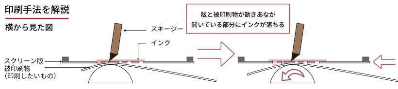 スクリーン印刷は、印刷したい形に穴をあけたスクリーン版を使う方法です。版の上にインクをのせ、スキージーと呼ばれるヘラで押し出すと、穴の部分だけインクが通り抜け、下に置いた素材にインクがのります。