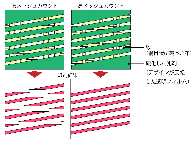 メッシュカウントが高いほど、印刷部分の孔が、紗の目にふさがれないため印刷の再現性が向上します。