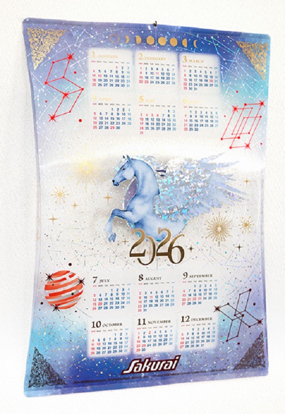 大同至高株式会社様にご制作いただいた本カレンダーは、クリアな素材にUVオフセットフルカラー印刷と箔加工を組み合わせて表現しております。サイドを折りこむことで、クリア素材ならではの透明感・浮遊感を実感していただける形状となっております。
