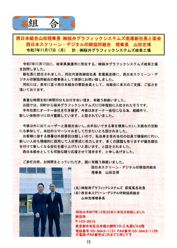 全日本スクリーン・デジタル印刷協同組合連合会が発行する業界紙「スクリーン・デジタル印刷界 2025年12月号」に、弊社代表取締役社長・若尾と、西日本スクリーン・デジタル印刷協同組合山田理事長との面会の様子が掲載されました。 本記事では、弊社の今後の展望や面会時の写真もあわせて紹介されています。 一覧に戻る一覧に戻る